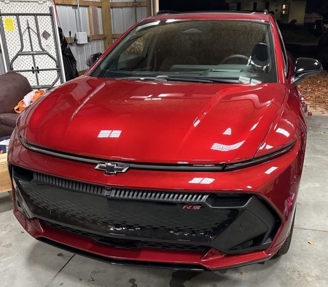 A photo of the shiny red 2025 Chevrolet Equinox EV RS shows the driver's stylish transition away from combustion-engine vehicles.