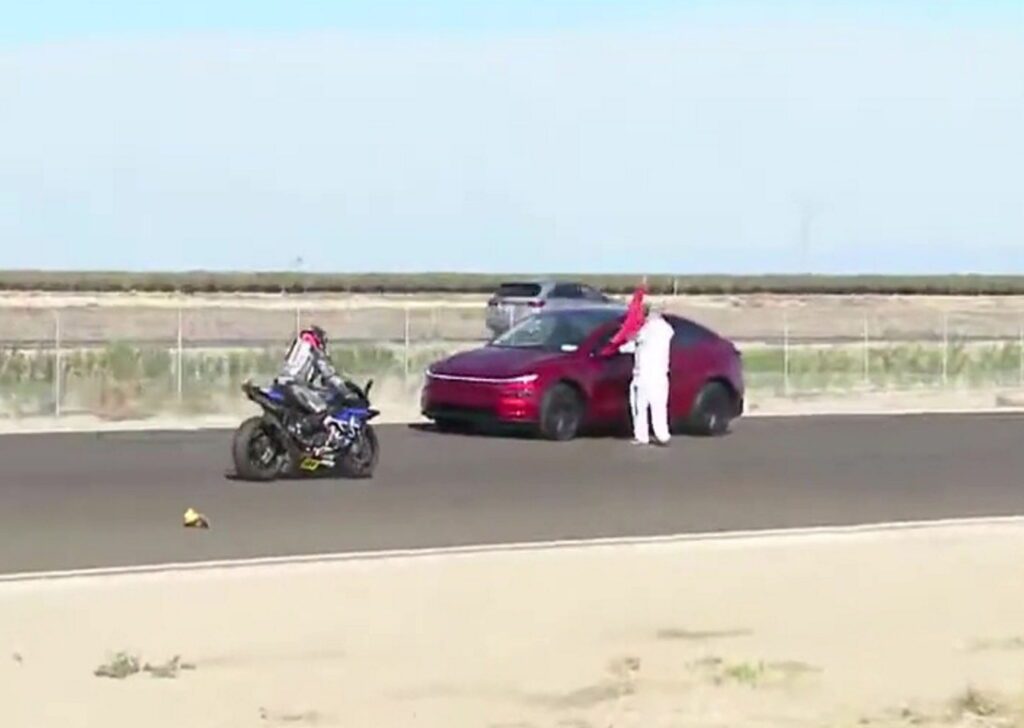 Jaw-dropping scenes saw a Tesla car drive onto a race track – in the middle of a superbike competition.